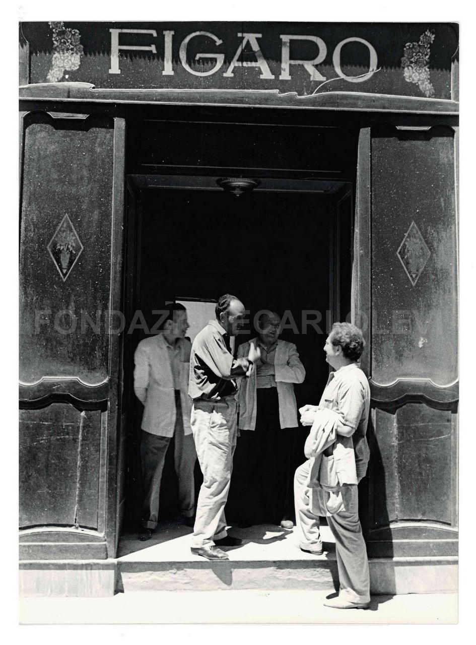Carlo Levi con Floriano Bodini fuori un barbiere di Lecce