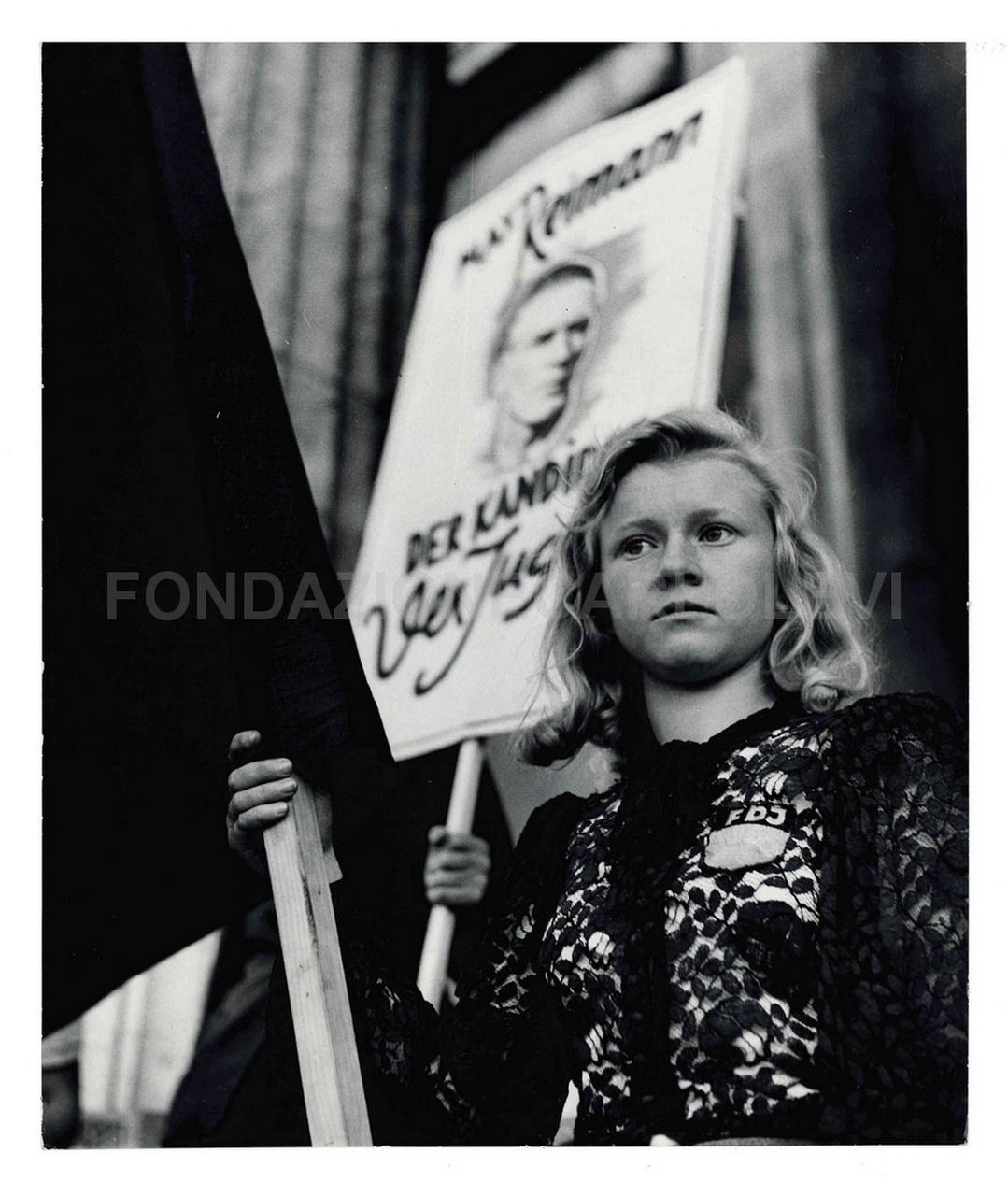 soggetto Giovane manifestante con bandiera, fuori la Munich Art Gallery a Koenigs Platz, durante una manifestazione del Partito Comunista