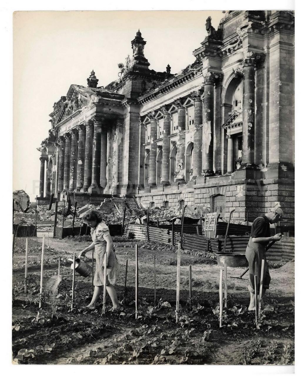 soggetto Donne al lavoro in un orto di guerra sotto le rovine del palazzo del Reichstag di Berlino