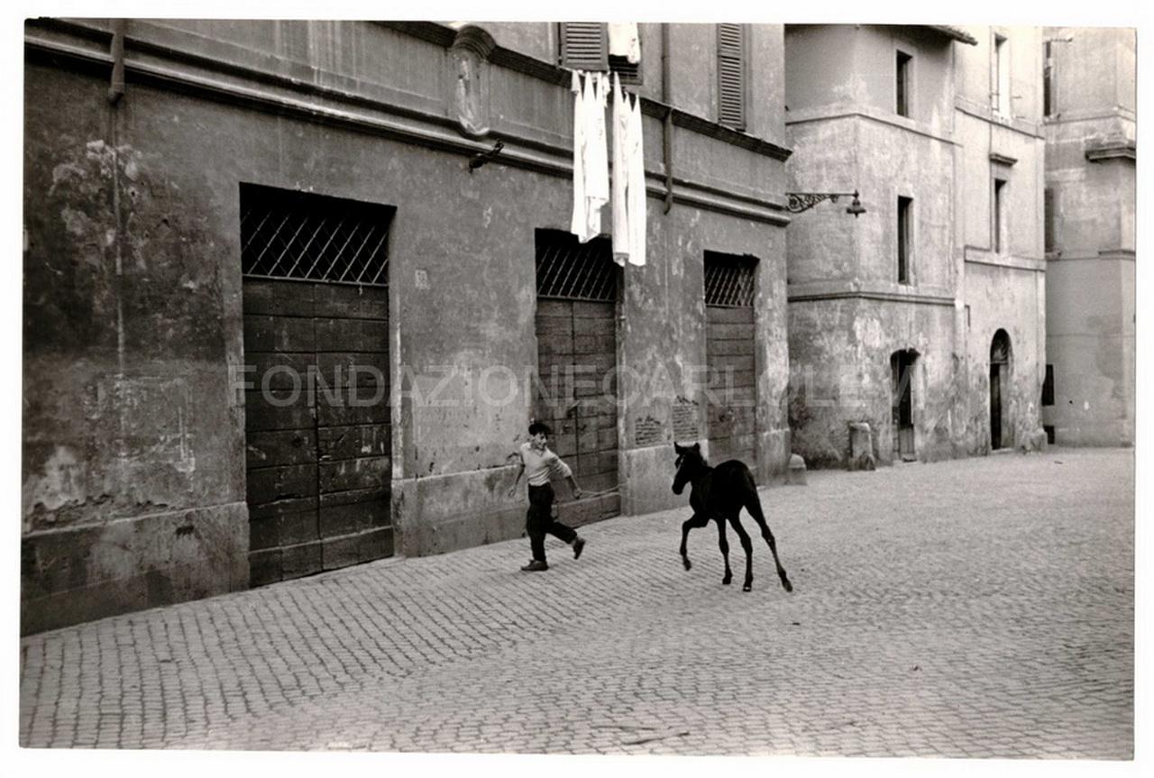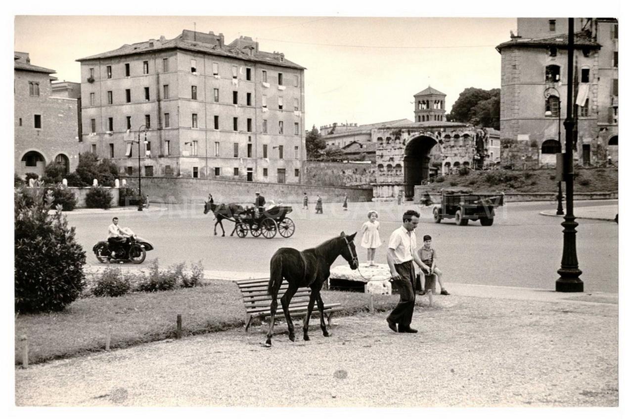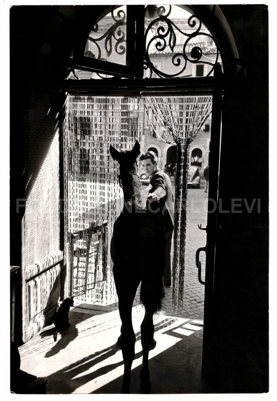 soggetto Bicchierino, il puledro che vive in Piazza dei Ponziani lascia l'interno di una trattoria insieme al gatto che l'accompagna