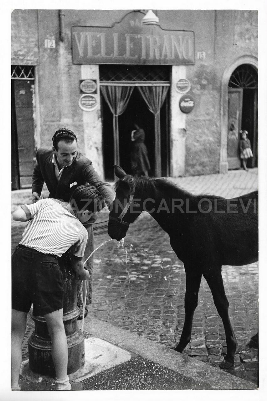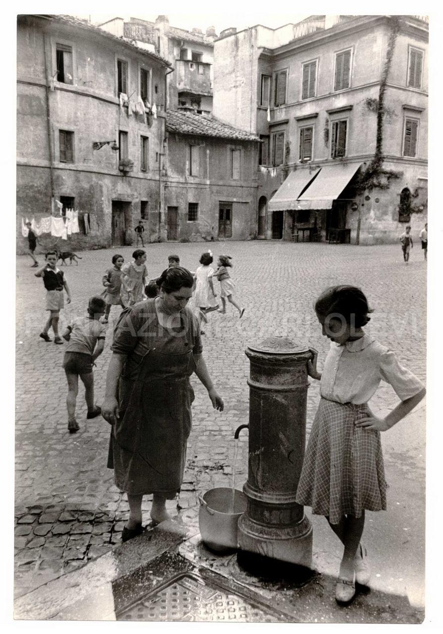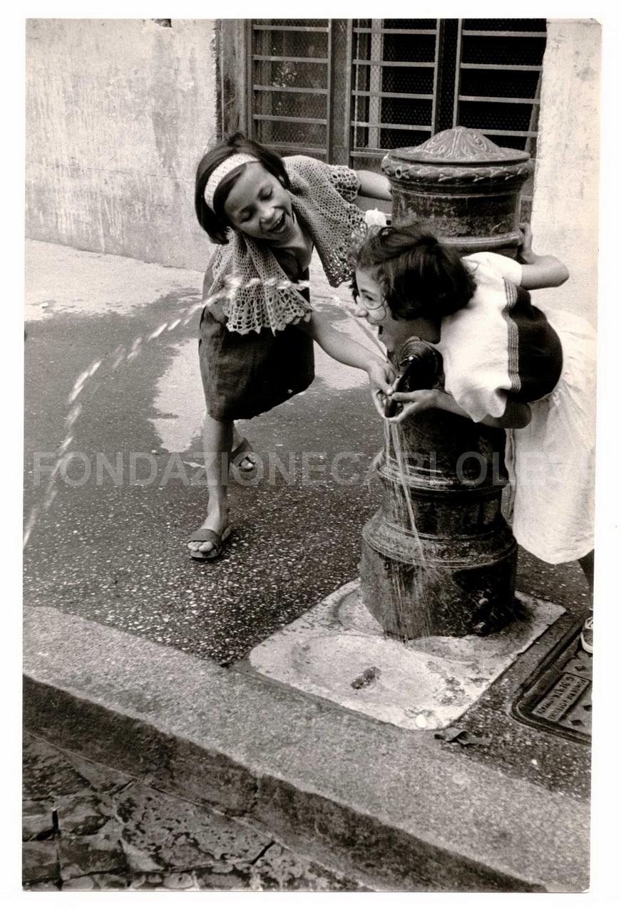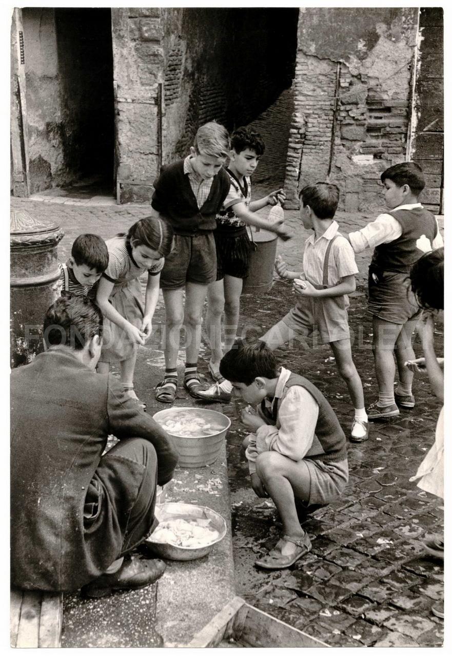 soggetto Gruppo di ragazzi che si intrattiene intorno ad un tipico "nasone" romano dove un adulto, probabilmente un "peracottaro", sta lavando la frutta sbucciata
