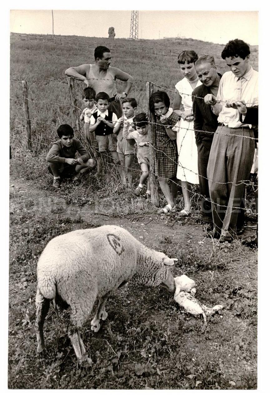 soggetto Gli abitanti della Piazza non abituati alla vita di campagna guardano con interesse e sorpresa una pecora che pulisce un vitellino