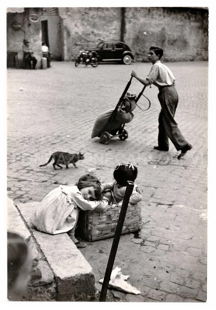 soggetto Bambini che giocano con un cesto mentre un ragazzo spinge un carrello ed un gatto osserva la scena