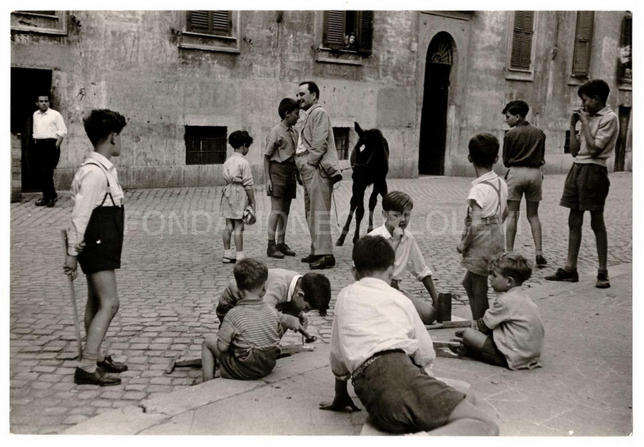 soggetto Donna e bambina intorno ad un "nasone" mentre un gruppo di bambini che gioca in piazza