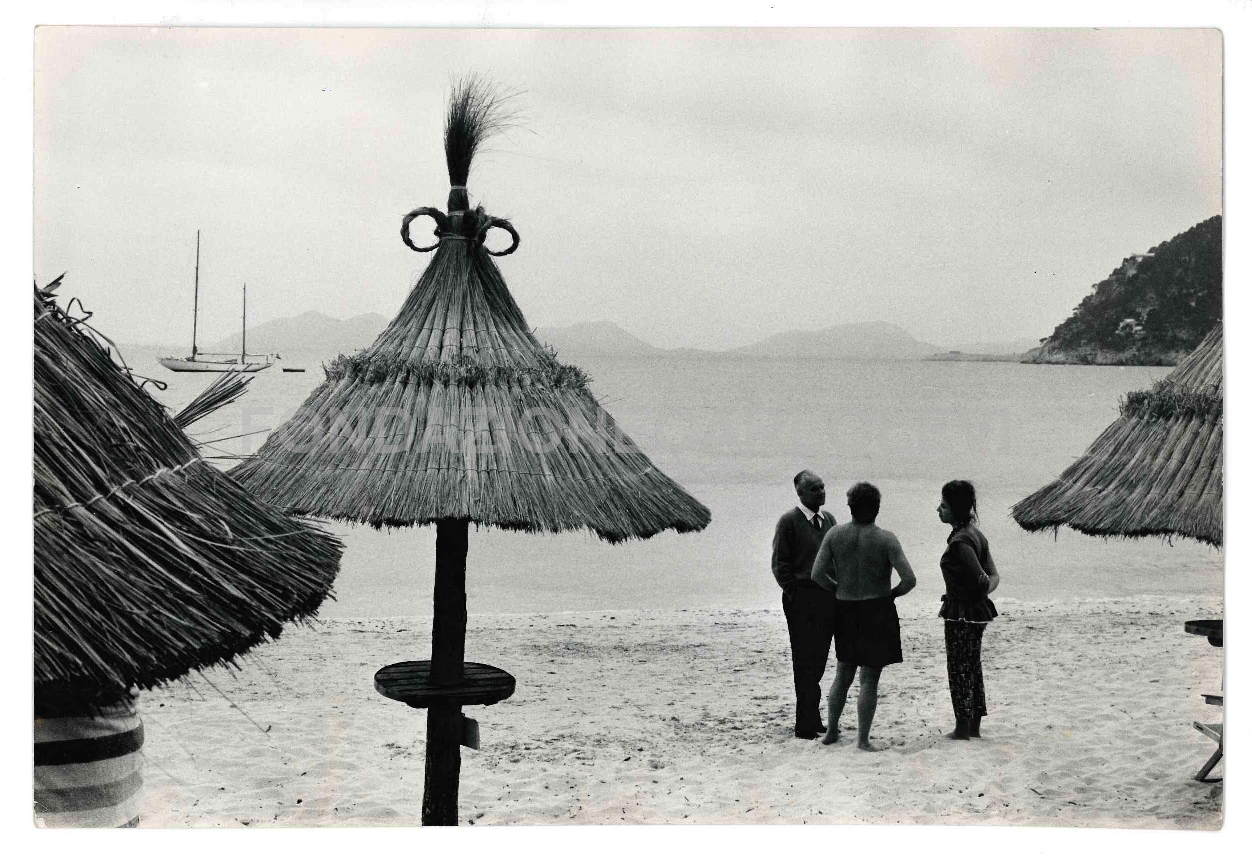 soggetto Levi con Alberto Moravia e Luisa Orioli sulla spiaggia con gli ombrelloni di paglia