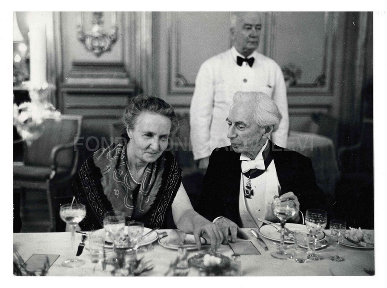 soggetto Irène Joliot-Curie insieme a Bertrand Russell nel 1950 durante la cena per il Nobel
