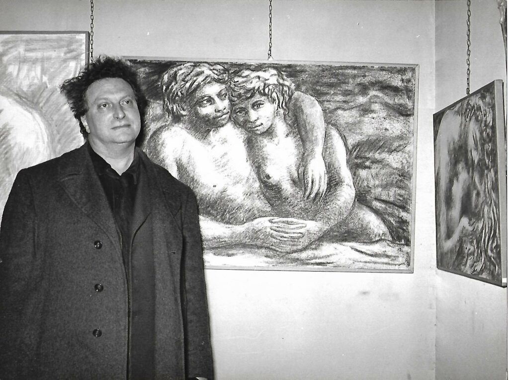 Davanti ad alcuni disegni della mostra “Gli Amanti”
