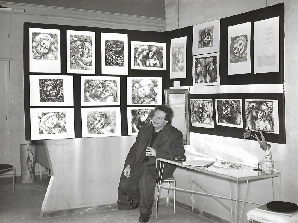 Levi seduto davanti all’allestimento delle litografie della mostra “Gli Amanti”, esposte alla Galleria del Pincio.